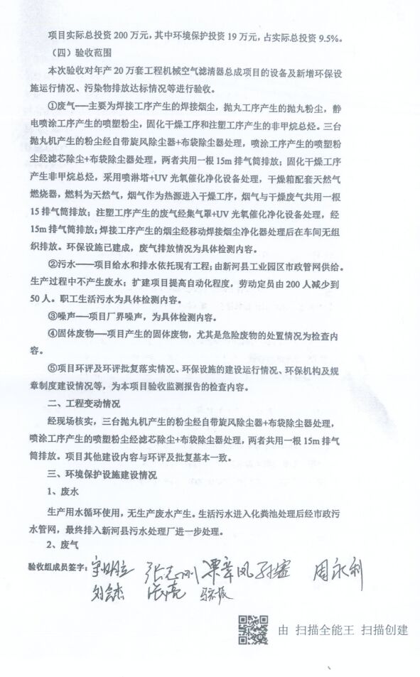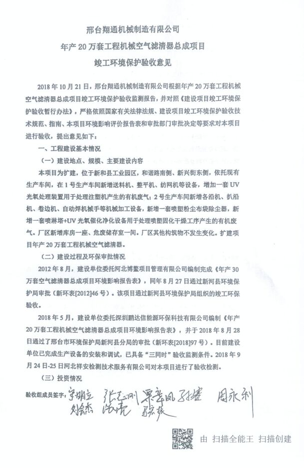邢臺(tái)翔通機(jī)械制造有限公司年產(chǎn)20萬套工程機(jī)械空氣濾清器總成項(xiàng)目竣工,環(huán)保保護(hù)驗(yàn)收意見。